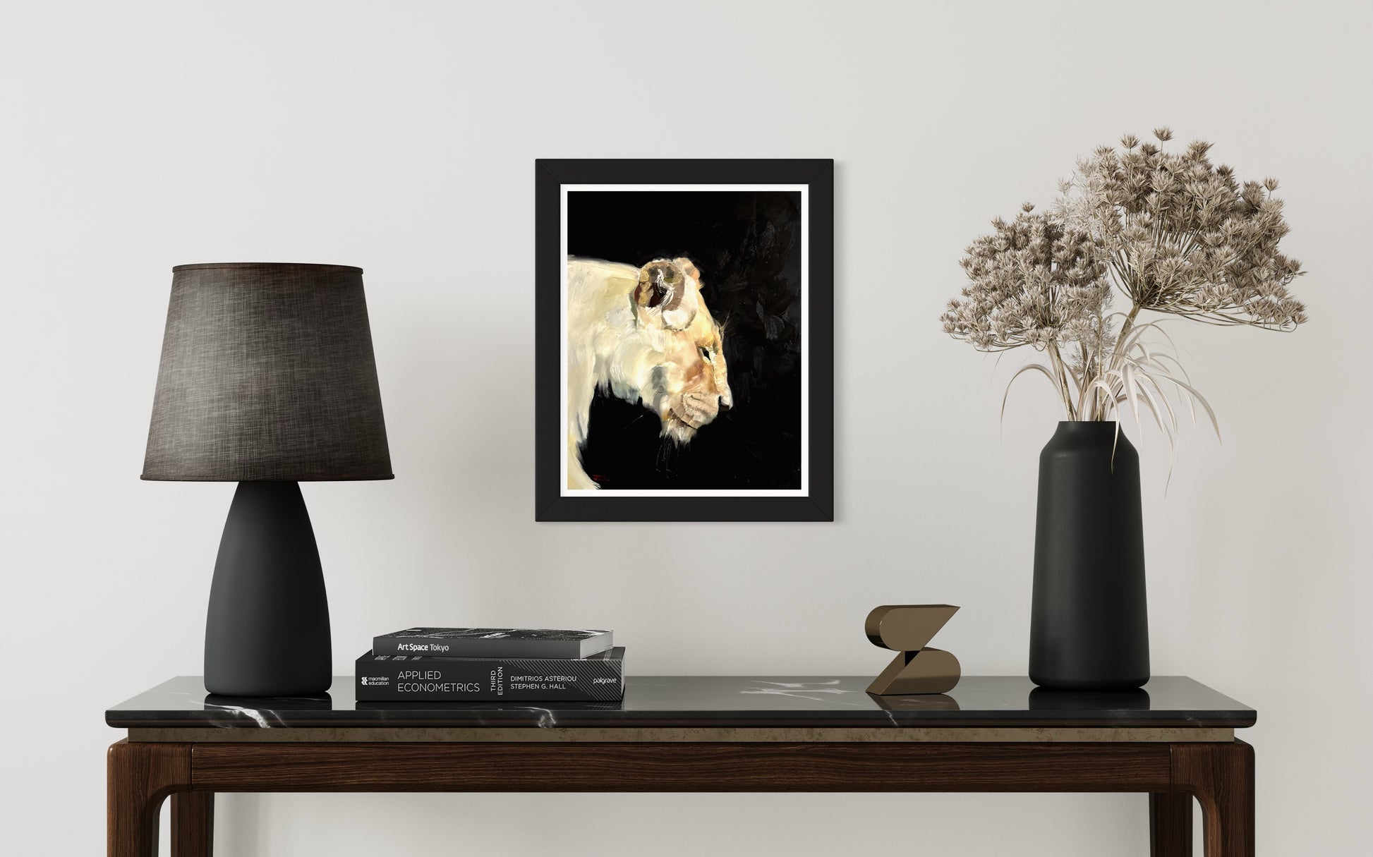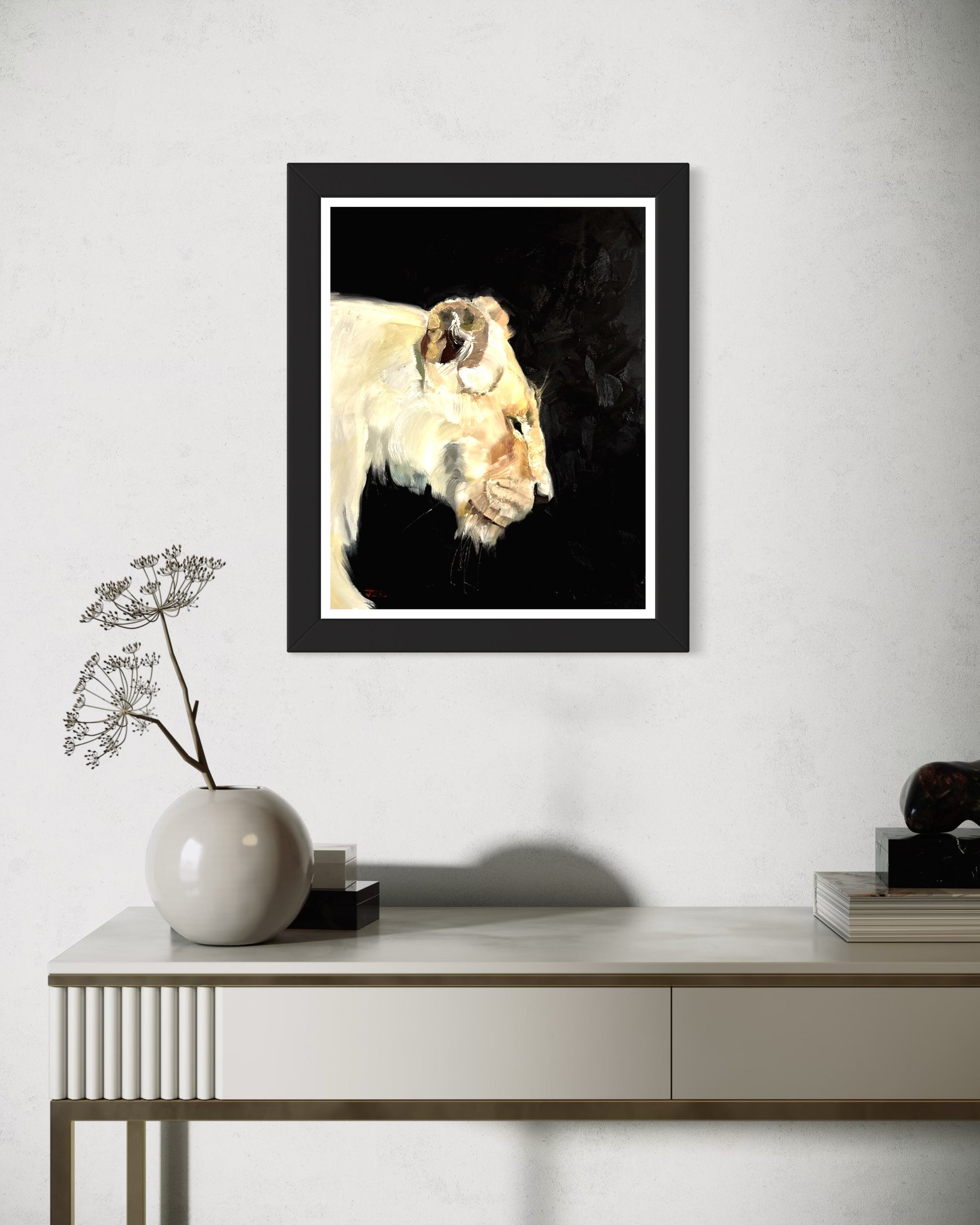 A serene, ghostly lioness emerges from shadow, blending elegance with quiet strength.